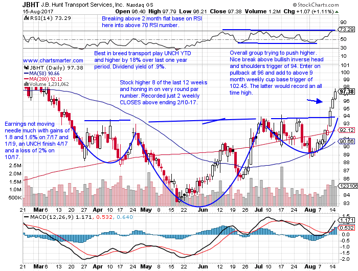 Stocks that can be bought as they pullback into bullish inverse head and shoulders breakouts are JBHTJBHT is a best in breed transport play UNCH YTD and higher by 18% over last one year period and sports a modest dividend yield of .9%. Earnings not moving needle much with gains of 1.8 and 1.6% on 7/17 and 1/19, an UNCH finish 4/17 and a loss of 2% on 10/17. The stock is higher 8 of the last 12 weeks and honing in on very round par number, which recorded just 2 weekly CLOSES above ending 2/10-17. The overall group is trying to push higher and it recently broke through a nice bullish inverse head and shoulders trigger of 94. Enter JBHT on a pullback at 96 and add to above 9 month weekly cup base trigger of 102.45.