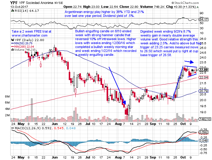 Taking a present view at YPF it has now formed a bull flag trigger after putting in a decent weekly gain. Its move IF a break occurs through the bull flag would be to 26.50 which would put it just pennies below a 26.58 trigger. It has put in a series on nice higher WEEKLY lows the week ending 8/11 which registered a strong hammer candle that reversed 10% off intraweek lows. Higher lows were also seen the week ending 12/30/16 which completed a bullish weekly morning star jumping 8.5% and week ending 1/22/16 which recorded a weekly engulfing candle adding 6.5%.