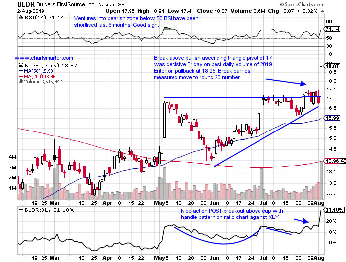 Buy pullback into bullish ascending triangle breakout BLDR 18.25. Stop 16.75.
